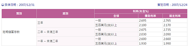 2007年底時台銀的一年期定期儲蓄存款固定利率是2.66%,現在是1.07%,下降1.59%,以本益比的角度來看,2.66%相當於本益比37.6倍,1.07%相當於本益比93.4倍